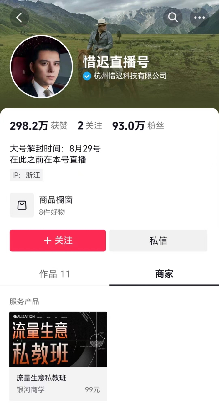 据悉,惜迟直播号是拥有蓝V认证的企业账号,显示为“杭州惜迟科技有限公司”,账号简介为“大号解封时间:8月29日,在此之前在本号直播”。