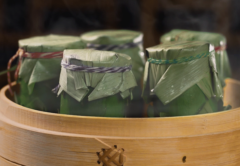 2、蒸煮:开袋后将竹筒粽置入蒸笼中蒸煮15-20分钟,直至竹筒粽熟透取出扎线,粽叶及竹筒即可使用。