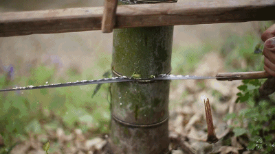 健康生长的竹子,将其锯成短筒,用泉水清洗