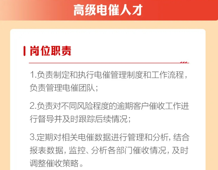 其中,高级催收管理人才要求有大学本科及以上学历,法律、金融专业背景,有五年及以上催收管理工作经验,具备优良的账款催收技巧及团队业务提升能力,能独立主导催收技巧培训及催收任务指标达成。