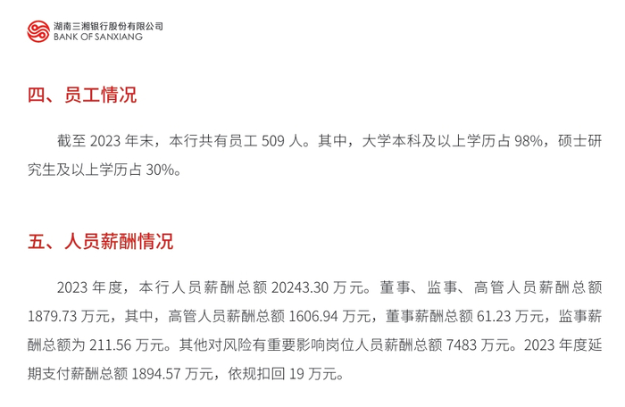 年报显示,截至2023年末,三湘银行共有员工509人,较上年减少42人;其中大学本科及以上学历占98%,硕士研究生及以上学历占30%。