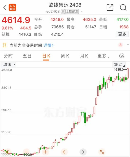 从行情图来看,这一波凌厉的涨势始于3月15日,集运指数(欧线)主力合约价格从最低点的1411,一路飙涨至今日收盘的4614.9,累计涨幅已高达227%。