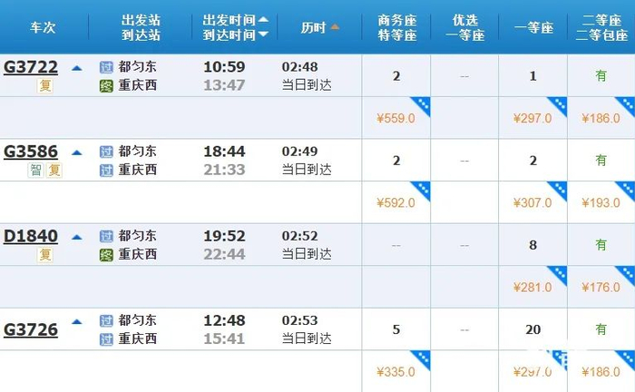 记者了解到,重庆至贵阳之前目前建设有全长345.4千米的渝贵铁路,已于2018年1月建成通车。该铁路为国铁Ⅰ级双线电气化快速铁路,设计时速200公里,两地之间的列车最快运行时间为1小时58分,二等座票价139元。