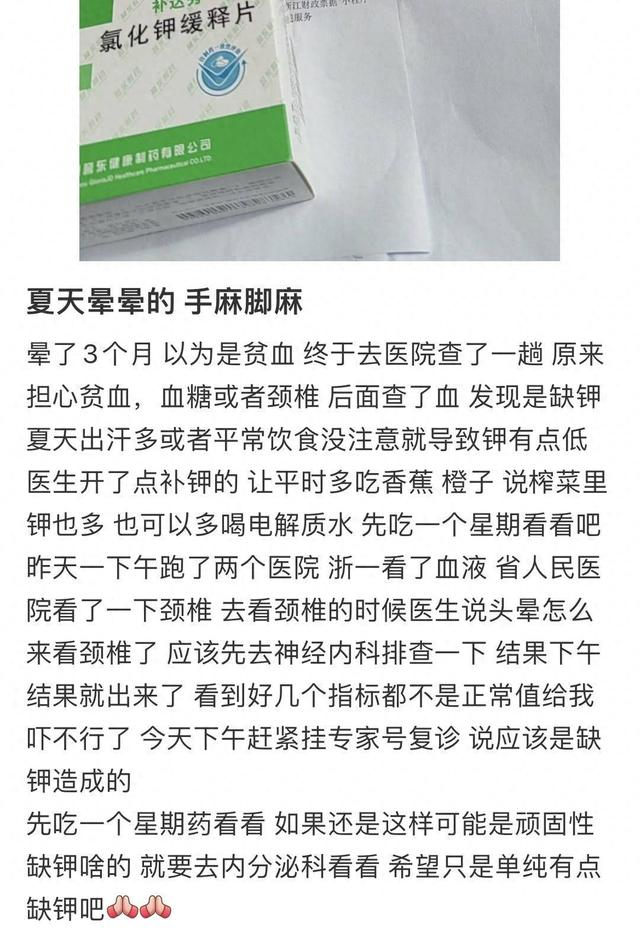 一般来说,血钾浓度低于3.5毫摩尔每升(mmol/L)即为低钾,低于3.0 mmol/L时可会出现明显症状。“夏季持续出现了3个月的头晕、手麻、脚麻。”网友“Asisea”在社交平台发帖称,开始怀疑自己贫血,于是调整了饮食,但症状未见好转。经过颈椎科、神经内科等排查后,专家指出,可能是缺钾造成的。“先吃一周药看看能不能将钾补上来,如若不行,再去内分泌科看看。”她分享道。