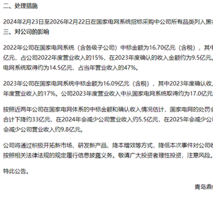 2024年2月27日,鼎信通讯收到国家电网通知:“根据国家电网舆情监测结果,公司可能存在向国家电网系统人员行贿的情况。按照相关规定,自2024年2月18日起,对公司全部采购品类启动招标采购‘熔断机制’。”