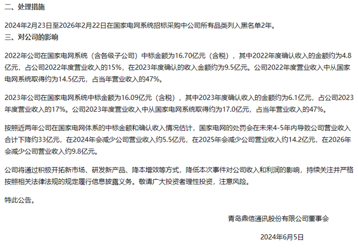 昨日晚间,鼎信通讯发布公告称,收到国家电网发布的就其不良行为处理情况通报,公司在国家电网系统招标采购中被列入黑名单2年,预计该处罚在未来4到5年内将导致公司营业收入合计下降约33亿元。在2024年会减少公司营业收入约5.5亿元,在2025年会减少公司营业收入约14.2亿元,在2026年会减少公司营业收入约9.8亿元。