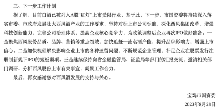 而宝鸡国资委也在2023年《对市十三届政协二次会议第309号提案的答复函》中提到,坚持对标上市公司标准,深化西凤集团改革,增强科技创新能力,完善公司治理体系,提高企业核心竞争力,为政策调整后企业再次IPO做好准备。