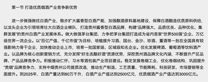 贵州省在2021年发布的“十四五”规划中提出,要以“百亿产值、千亿市值”为目标,培植提升习酒、国台、金沙、珍酒、董酒等一批在全国具有较强影响力骨干企业,加快推动企业上市。