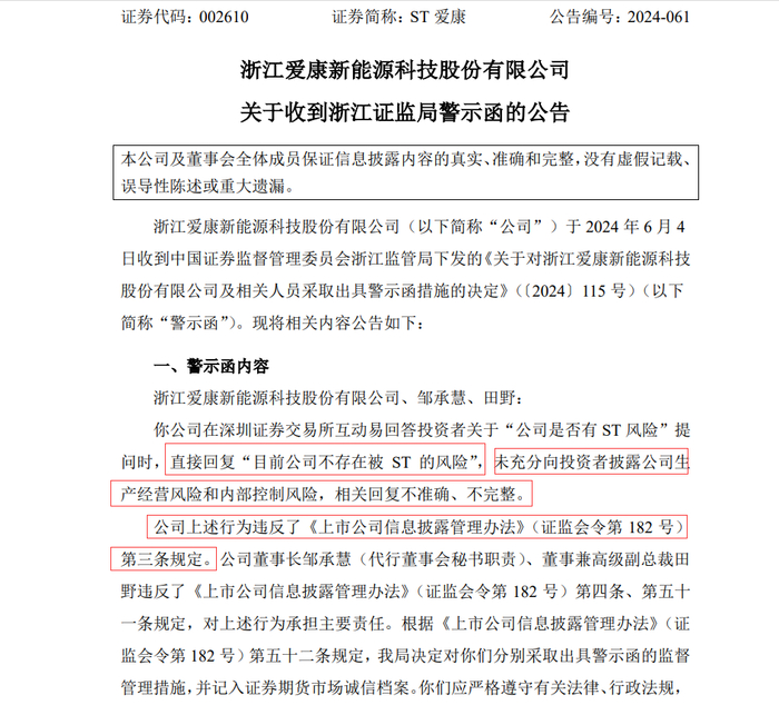 警示函称,ST爱康上述行为违反了《上市公司信息披露管理办法》(证监会令第182号)第三条规定。公司董事长邹承慧(代行董事会秘书职责)、董事兼高级副总裁田野违反了《上市公司信息披露管理办法》(证监会令第182号)第四条、第五十一条规定,对上述行为承担主要责任。根据《上市公司信息披露管理办法》(证监会令第182号)第五十二条规定,浙江证监局决定对公司及相关责任人分别采取出具警示函的监督管理措施,并记入证券期货市场诚信档案。公司及相关责任人应严格遵守有关法律、行政法规,提高规范运作意识,确保信息披露真实、准确、完整。请公司及相关责任人在收到本决定书之日起10个工作日内向浙江证监局提交书面报告。浙江证监局将根据现场检查情况采取进一步监管举措。