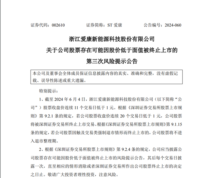 4日晚间,ST爱康再度公告提示了面值退市风险。