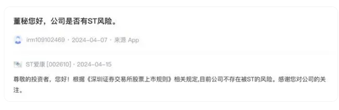 (4月15日,ST爱康在深交所互动易回答投资者关于“公司是否有ST风险”提问时,直接回复“目前公司不存在被ST的风险”)