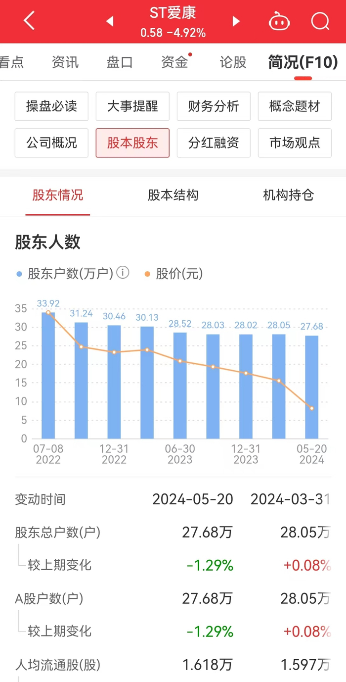值得注意的是,截至5月20日,ST爱康股东总数仍高达27.68万户。流通股人均持股数为1.62万股。