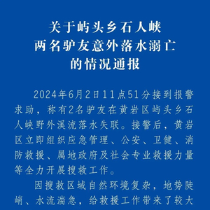 6月3日16时37分许,新京报记者从浙江省台州市黄岩区应急管理局获悉,石人峡不是景区,但通往石人峡的道路是开放的,这次是户外爱好者的自发行为。