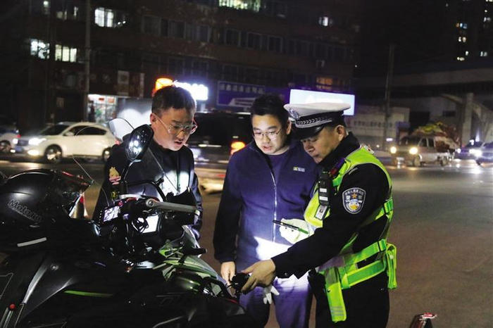 交警夜查摩托车射灯