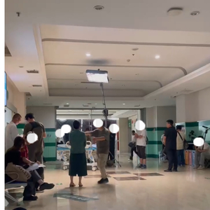 视频显示,在该医院的ICU区域不远处,有疑似剧组的工作人员架起一盏巨大的补光灯,正对准一张病床进行照明,旁边还有部分摄像设备。从视频拍摄角度看,剧组的布景设置已经占据了通道的一半空间。