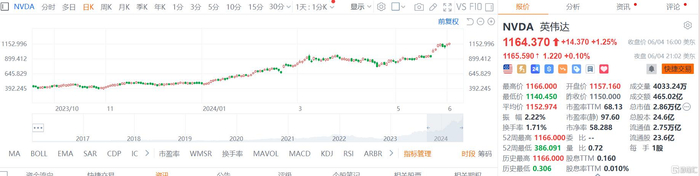 隔夜,英伟达收涨1.25%,报1164美元,股价再创历史新高,成交465亿美元,总市值2.86万亿美元,逼近苹果的2.98万亿美元。
