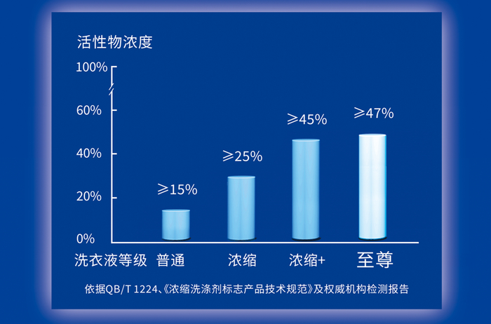 相比国标标准洗衣液,蓝月亮至尊洗衣液采用“浓缩+”配⽅,活性物含量高达47%,是国标标准洗衣液的3倍。