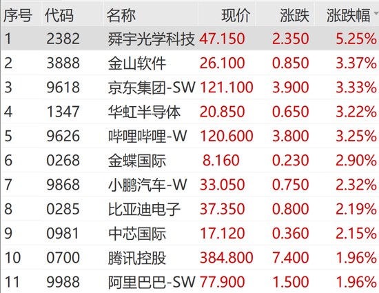 港股市场今日高开后持续走高,截至发稿,三大指数涨幅均超1%。舜宇光学科技领涨恒生科技指数。
