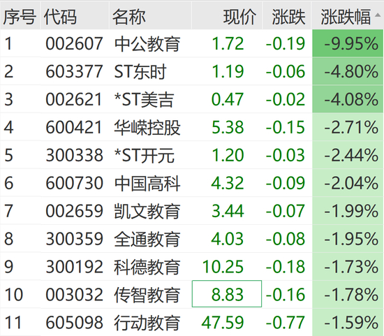 上午教育板块整体走低,ST东时、华嵘控股、中国高科等跟跌。