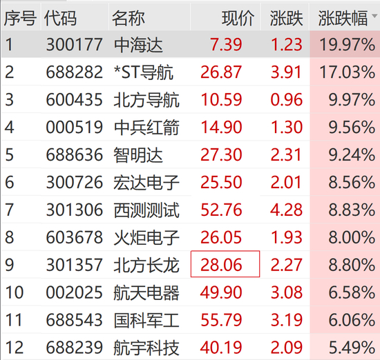 另外,上午航天军工板块火热,卫星导航概念股爆发。中海达20CM涨停,北方导航、中兵红箭涨停,北方长龙、智明达、宏达电子等多股大涨。