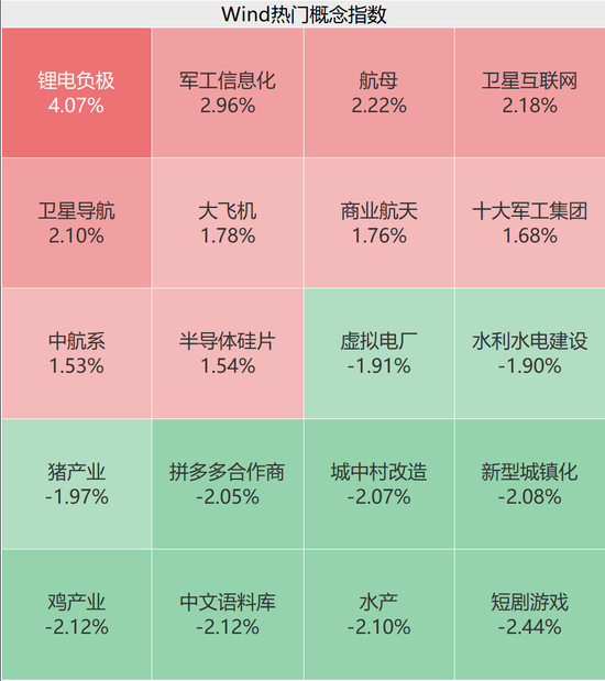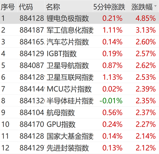 行业板块上,上午航天军工、半导体、煤炭、电力等板块走势较好,锂电负极、卫星导航等概念集体拉升;传媒、教育、地产等板块不振。