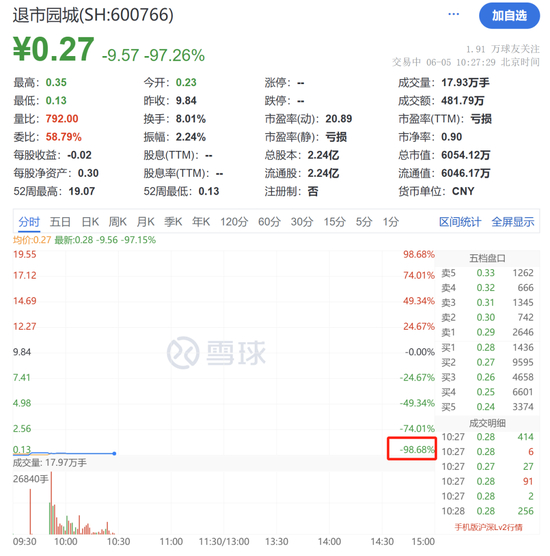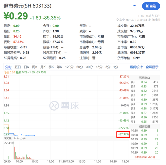 6月5日上午,退市园城、退市碳元、退市同达三只退市股集体复牌,首日出现无悬念暴跌。