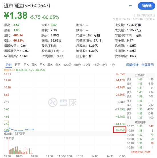 上午开盘后不久,退市园城、退市同达、退市碳元交易触及盘中临时停牌。上交所自9时30分开始暂停其交易,9时40分起恢复交易。截至发稿,退市园城跌幅最高达到98.68%,退市同达跌逾85%,退市碳元跌逾87%。