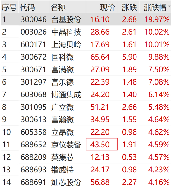 个股方面,台基股份20CM涨停,中晶科技、上海贝岭封板,国科微、富乐德、富满微等多股跟涨。