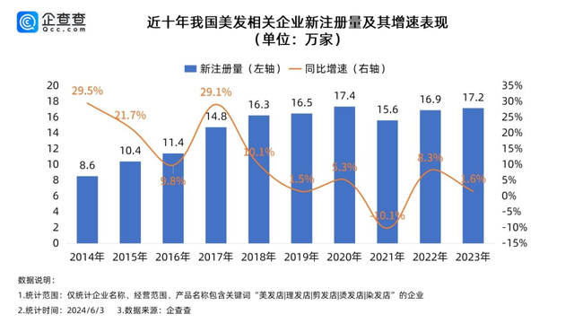 经过多年发展,我国美发产业逐年发展壮大,且在2023年注册数量创出新高。