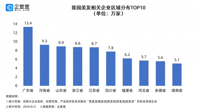 企查查数据显示,企业存量方面,我国现存128.8万家美发相关企业,地域分布上,广东省现存13.4万家美发相关企业,是全国唯一存量突破10万家的区域,其次是河南、山东、浙江、江苏分别现存9.3万家、8.9万家、8.8万家、8.7万家美发相关企业,排名前五,其余区域美发相关企业存量均在8万家以内。