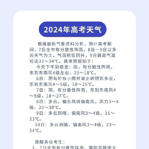 南京发布高考天气预报:6月7日有分散性降水,9日最高33℃