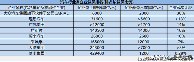 从理想汽车、广汽本田、特斯拉、大众、蔚来,再到零部件供应商大陆集团、博世集团、采埃孚集团等,各大企业纷纷祭出裁员大旗,有的企业裁员比例甚至高达30%。