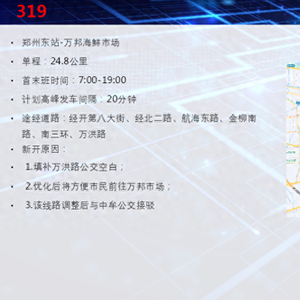 为进一步提升公交服务质量,完善市民出行环境,让市民能够更方便的往返郑州和中牟,根据市民的出行需求和实际情况,郑州公交公司现已开通往返郑州东站至中牟万邦海鲜市场的319路公交线路。