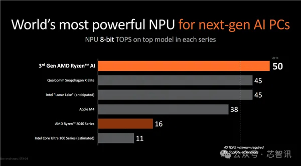 作为对比,高通骁龙X Elite的NPU的算力为45TOPS,苹果M4的NPU的算力只有38TOPS,虽然AMD最新推出的AI PC芯片——锐龙AI 300系列集成的AMD第三代NPU内核的AI算力提升到50TOPS,英特尔Lunar Lake的NPU内核的AI算力48TOPS略低,但是依然是大幅超过了微软对于Copilot+ PC的最低NPU算力40TOPS的需求门槛,并且英特尔更专注于提供更高的综合的AI算力,即通过AI引擎结合NPU、CPU和GPU,将综合AI算力提高到了120TOPS,达到了上代Meteor Lake的接近3倍,这样的提升幅度不可谓不高。