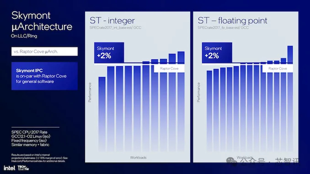 这对于移动和桌面设计同样有用。换句话说,Skymont E 核心非常灵活,在移动场景中充分利用了低功耗结构和系统缓存,并针对桌面计算块优化了多线程吞吐量。与 Raptor Cove 相比,Skymont在单线程工作负载中提供了 2% 更好的整数和浮点性能,其功率和热量范围几乎与其前代产品相同。