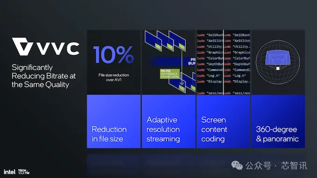 多媒体引擎方面,英特尔采用 VVC 编解码器对视频压缩技术的改进意义重大。与 AV1 相比,此编解码器可将文件大小减少 10%,并支持自适应分辨率流媒体和针对 360 度和全景视频的高级内容编码。这将确保流媒体的比特率较低,而不会降低质量——这是现代多媒体应用的一个基本方面。
