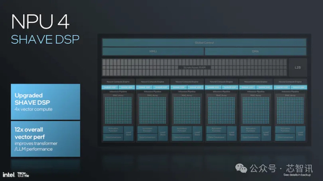NPU 4 中的 SHAVE DSP 升级,使得其矢量计算能力达到了 NPU 3 的四倍,将整体的矢量性能整体提高 12 倍。这对于转换器和大型语言模型 (LLM) 性能非常有用,使其更加快速和节能。增加每个时钟周期的矢量操作可以实现更大的矢量寄存器文件大小,从而显著提升 NPU 4 的计算能力。