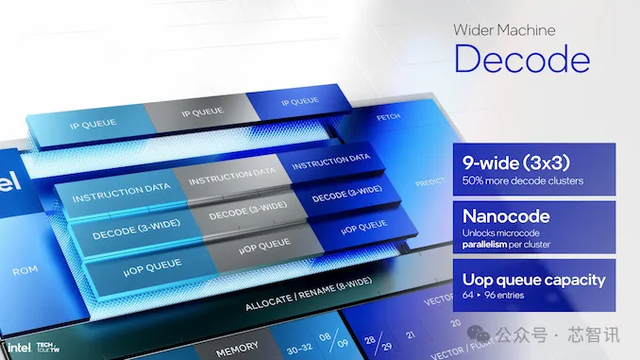 Skymont 核心具有更全面的微架构,首先是 9-wide 解码阶段,其解码簇比前几代多 50%。这由更大的微操作队列支持,现在可容纳 96 个条目,而旧设计中只有 64 个。使用“Nanocode”可在每个解码簇内增加更多微代码并行性。
