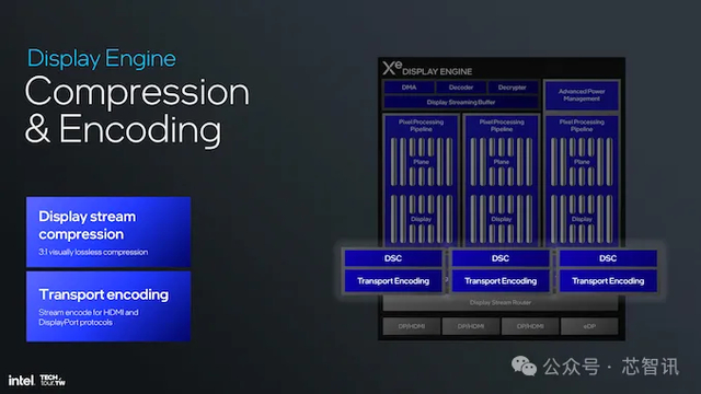在压缩和编码方面,Xe2 架构可无损地将显示流压缩率提高到 3:1,包括针对 HDMI 和 DisplayPort 协议的传输编码。这些芯片功能可进一步降低数据负载,并在输出端保持高分辨率,而不会损失视觉质量。