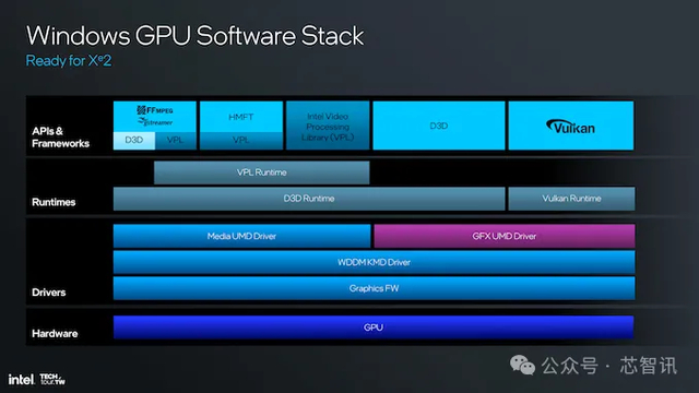 Windows GPU 软件堆栈从上到下都非常强大,支持 D3D、Vulkan 和 Intel VPL API 和框架。这意味着,结合这些品质可以为市场上各种运行时和驱动程序提供全面支持,从而提高其在不同软件环境中的整体效率和兼容性。