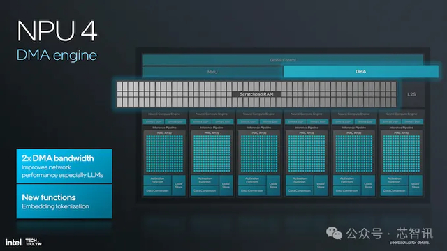 NPU 4 的带宽改进对于处理更大的模型和数据集至关重要,尤其是在基于 Transformer 语言模型的应用程序中。该架构支持更高的数据流,从而减少瓶颈并确保即使在运行时也能顺利运行。NPU 4 的 DMA(直接内存访问)引擎将 DMA 带宽翻倍——这是提高网络性能的重要补充,也是处理重型神经网络模型的有效方法。进一步支持更多功能,包括嵌入标记化,从而扩大了 NPU 4 的潜力。