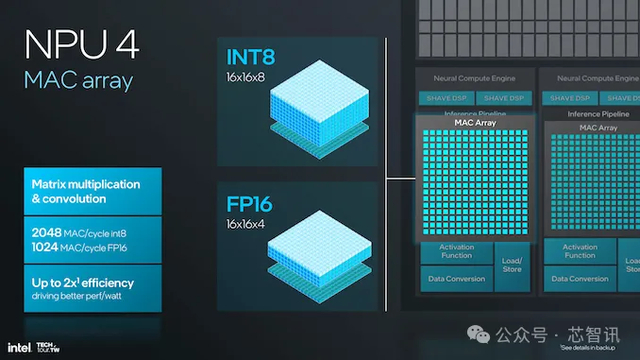 该架构支持 INT8 和 FP16 精度,INT8 每周期最多可进行 2048 次 MAC(乘法累加)运算,FP16 每周期最多可进行 1024 次 MAC 运算,这显然表明计算效率显著提高。