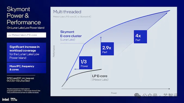 当将 Skymont E-core 集群与 Meteor Lake的 LP E-core 集群直接进行比较时,多线程性能提高了 2.9 倍,而功耗却全面降低。