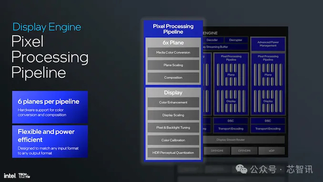 描绘像素处理管道是英特尔显示引擎所依赖的基本基础之一,每条管道支持六个平面,用于高级颜色转换和合成。此外,它还集成了对颜色增强、显示缩放、像素调整和 HDR 感知量化的硬件支持,确保屏幕上的图形生动准确。该设计非常灵活,非常节能,性能经过精心设计,至少在纸面上支持各种输入和输出格式。到目前为止,英特尔尚未提供任何可量化的功率指标、TDP 或其他功率元素。