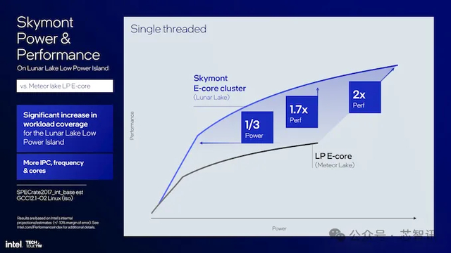 英特尔公布的性能指标,凸显了Skymont E核的电源效率的显著提升:与上代的Meteor Lake 的 LP E 核相比,单线程性能提高了 1.7 倍,而功耗仅为其三分之一。