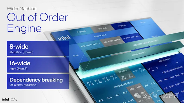 Skymont核心的无序执行引擎也得到了显著改进。分配宽度增加到 8-wide,而退出阶段则加倍到 16-wide。这增强了内核同时发出和执行多条指令的能力,并通过依赖中断机制减少了延迟。