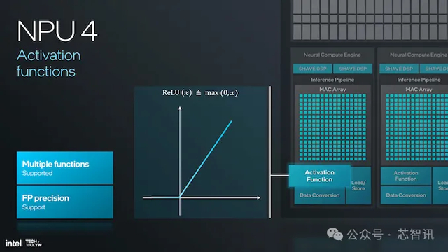 NPU 4 支持激活函数,现在有更多种类的激活函数可以支持和处理任何神经网络,并可选择精度来支持浮点计算,这将使计算更加精确和可靠。改进的激活函数和优化的推理管道,将使其能够以更快的速度和更高的准确度执行更复杂和更细致的神经网络模型。