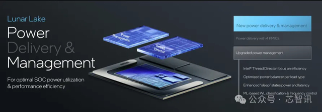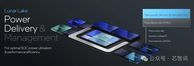 在供电方面,Lunar Lake采用了新的4个PMIC供电设计,可提供更多的供电路径、动态电压ID与更多的监控功能。针对SoC的供电使用优化达到最佳的性能效率。