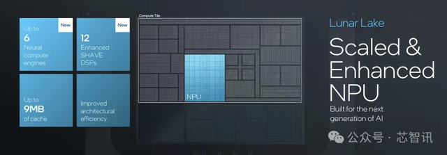 作为新一代面向笔记本电脑的AI PC处理器,Lunar Lake的神经处理单元(NPU)带来了重大升级,其集成了全新的第四代NPU内核(NPU 4),具备6个Neural Compute引擎、12个强化SHAVE 数字信号处理器(DSP)与9MB缓存,能够提供48 TOPS的AI算力。