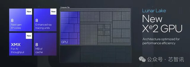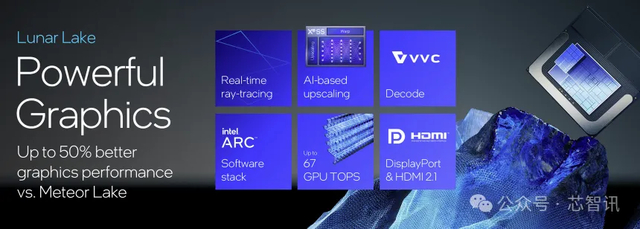 Lunar Lake的GPU采用的是新一代的Xe2 GPU构架,拥有8组新一代Xe核心、8个光线追踪单元、XMX AI引擎和8MB的专属缓存。能够提供67 GPU TOPS的算力、实时的光线追踪、基于AI的XeSS画质提升、Intel Arc软件堆叠等功能,相比上一代Meteor Lake能带来50%的图形处理性能提升。